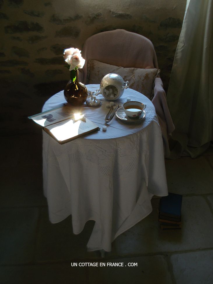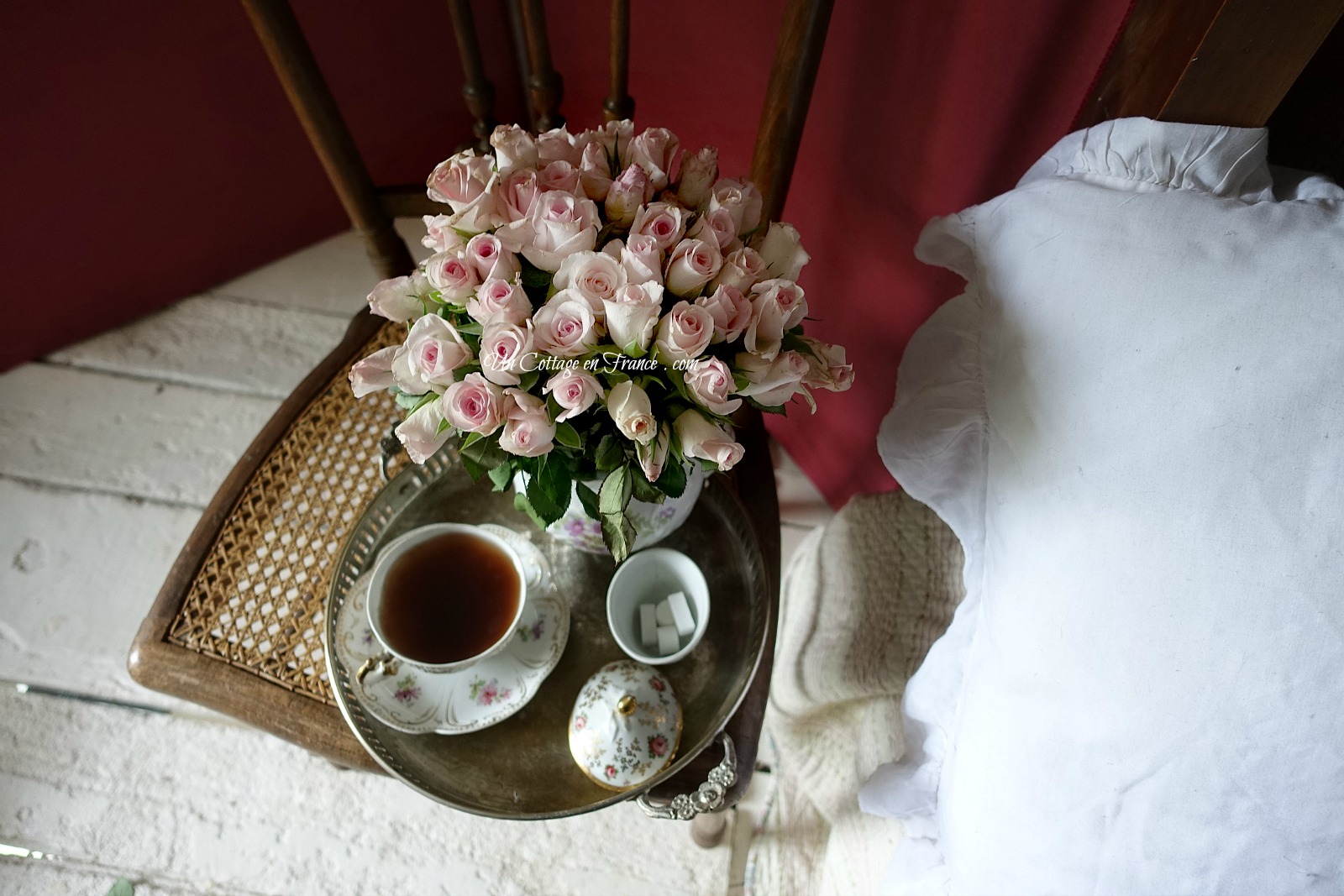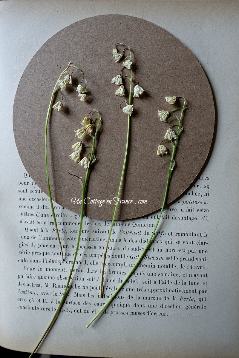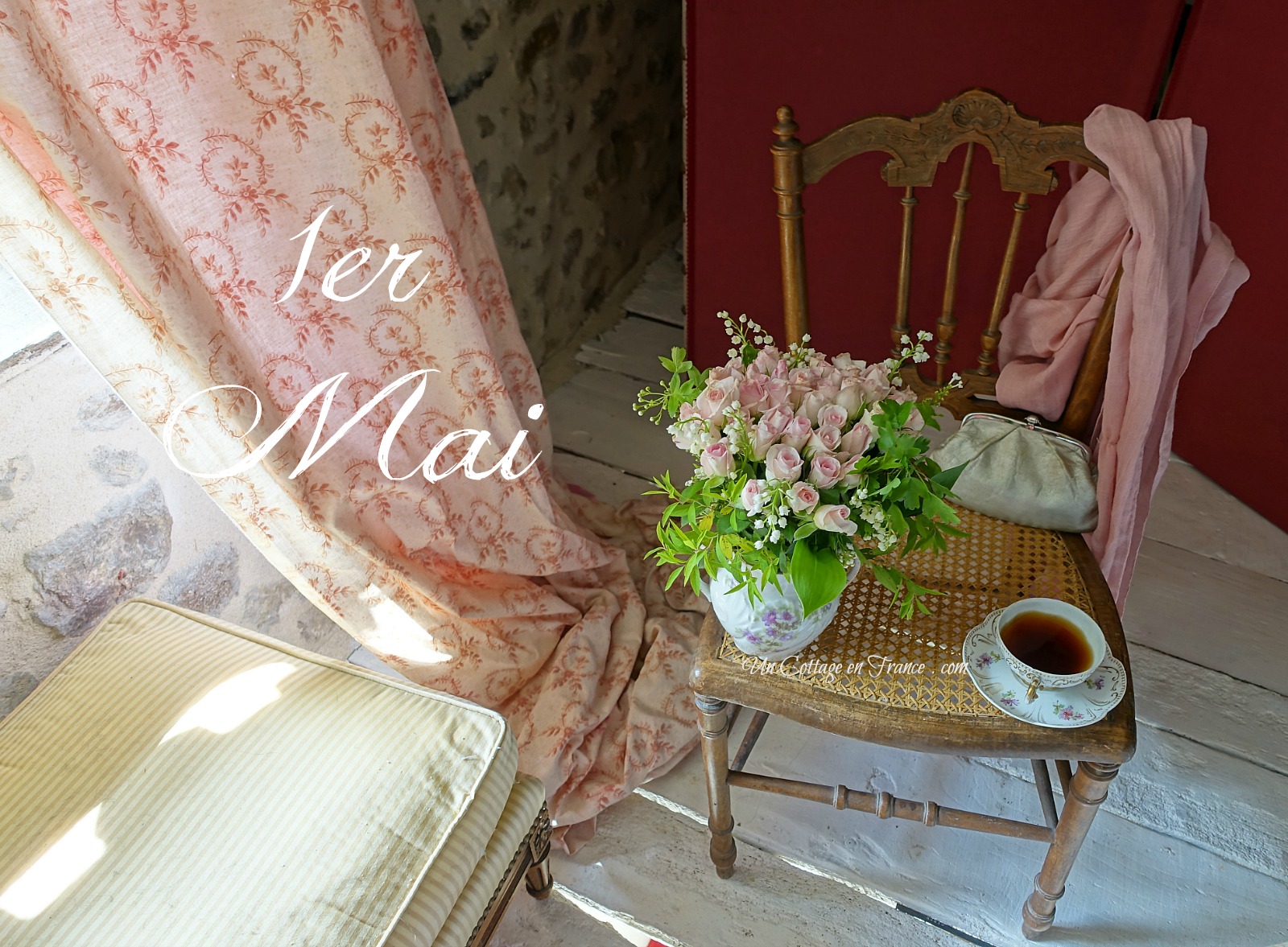 A few sprigs of lily of the valley and tips of white lilac complete a bouquet of small roses in the bedroom. It is said that only the sprigs of lily of the valley given as a gift should be kept, associated with a wish. Finding them months or years later by chance in the pages of a book, indicates that the wish is beginning to come true. Except… one rarely remembers the content of the wish in question.