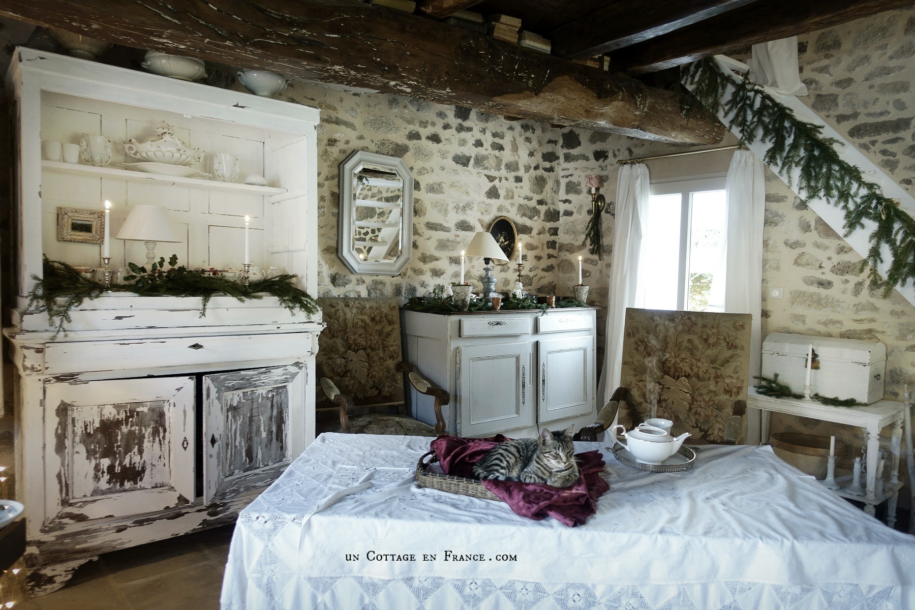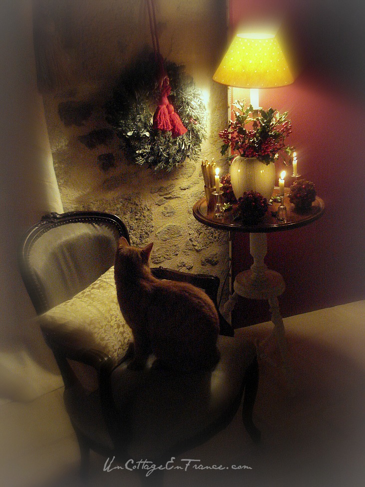 Peut-être qu’on n’a même pas besoin des classiques boules et guirlandes de Noël ! Quelques branches de sapin et de houx devraient suffire. Et avec des bougies, des fleurs rouges et blanches, tout autour d’un joli chat sur un plateau, c’est parfait…