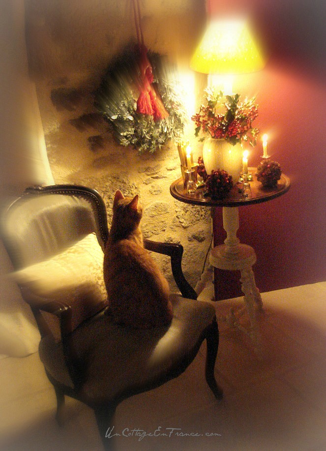 Maybe you don’t really need those classic Christmas garlands and ornaments! Just some fir and holly branches could do the job, along with candles and some red and white flowers, all set around a cute cat chilling on a tea tray